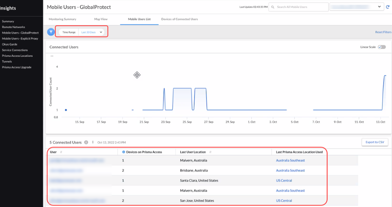 You can view the list of GlobalProtect Mobile Users who were connected in the last 30 days with the user_list resource.